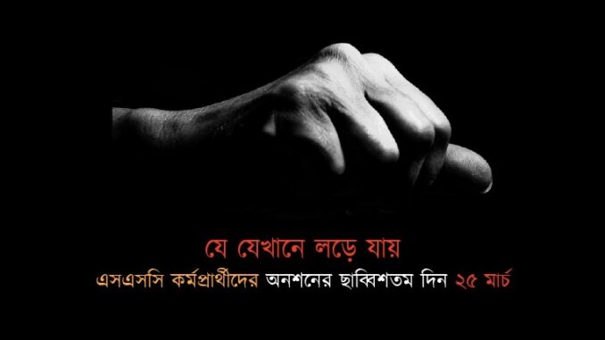 অনশনের ২৬ দিন পেরিয়ে গেল। এসএসসি-র কর্মপ্রার্থীদের সমর্থনে আজ প্রথম শহরের মানুষকে দেখলাম এপিডিআর-এর ডাকে রাজপথে মিছিল করতে। এতদিন যে তাদের প্রতি কেউ সহানুভূতি দেখিয়ে পাশে দাঁড়াননি তা নয়। রাজনীতির মানুষ এসেছেন, ব্যক্তিগতভাবে কোনও লেখক কবি এসেছেন, সাধারণ মানুষ এসেছেন তাঁদের প্রতি সহানুভূতি দেখিয়েছেন, তাঁদের আন্দোলনের প্রতি সমর্থনও জানিয়েছেন। আজ রাস্তায় নেমে যে সব মানুষ কর্মপ্রার্থীদের দাবির প্রতি স্পষ্ট সমর্থন জানালেন, তাঁরা নিশ্চিতভাবে আন্দোলনকারীদের মনোবল অনেকখানি বাড়িয়ে দিলেন। কিন্তু আরও আগেই কি কলকাতা শহরের মানুষের কাছে এই সচেতনতা প্রত্যাশিত ছিল না? বিশ্বাস করি না আমাদের গণমাধ্যমের সবাই সরকারের কাছে নিজেদের বিবেককে গচ্ছিত রেখেছেন। অথচ তাঁরাও কর্মপ্রার্থীদের আন্দোলনকে গুরুত্ব দিতে দেরি করে ফেললেন। আমরা কি ভাবছিলাম দেখি পরিস্থিতি কতদূর যায়, কতদূর যেতে পারেন কর্মপ্রার্থীরা?