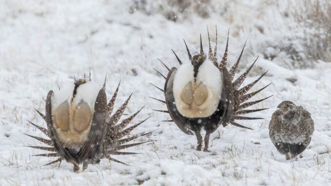তুষারপাত উপেক্ষা করে লড়াই দুই সেজ গ্রাউজের। পাশে পড়ে ঝাপটাঝাপটিতে খসে পড়া পালক