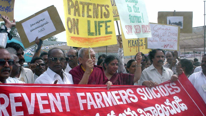 কৃষিকাজের একেবারে গোড়ার কথা বীজ। শস্য উৎপাদনের প্রাথমিক হাতিয়ার এবং কৃষকদের জীবনের ভিত্তি। প্রায় দু’দশক হতে চলল, ভারতীয় কৃষকদের হাত থেকে তুলোর বীজ কেড়ে নিয়েছে মনসান্টো। তুলো চাষের জন্য, স্থানীয় বীজ বৈচিত্র্যকে তছনছ করে জিএমও (জেনেটিক্যালি মডিফায়েড) বিটি কটন চালু করেছে। তার রয়্যালটি-র নামে বীজের দাম বাবদ কৃষকদের কাছ থেকে লাগামছাড়া টাকা আদায় করেছে। ১৯৯৮ সালে মনসান্টো ভারতে ব্যবসা শুরু করে। তারপর থেকে তুলোর দাম বেড়েছে ৮০, ০০০ শতাংশ (প্রতি কেজি ৫-৯ টাকা থেকে ৪৫০ গ্রামের দাম ১৬০০ টাকা)। ফলনে ক্ষতি এবং ঋণ এই দুইয়ের জাঁতাকলে পড়ে ৩০০,০০০০ চাষী আত্মহত্যা করেছেন। এর মধ্যে ৮৪ শতাংশ মৃত্যুর জন্য সরাসরি দায়ী মনসান্টো।