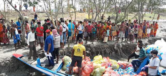 নোনা জল ঢুকে-যাওয়া এই প্রত্যন্ত গ্রামে খানিক আগেই এসে লেগেছিল শহরের বোট। আপাদমস্তক কোভিড প্রোটেকশনে থাকা দাদা-দিদিরা বোট থেকেই বস্তা-বস্তা ত্রাণ বিলিয়ে দিয়েছেন। দু’হাত পেতে দাঁড়িয়ে থাকা মানুষের কাছে, এ-দৃশ্য অনেকটা হরির লুঠের মতো। সুন্দরবনের মানুষ একে ‘ত্রাণ ধরা’ বলেন। যিনি যত ভাল ফিল্ডার, ক্যাচ ধরার দক্ষতা যাঁর যত বেশি, দিনের শেষে তাঁর জিম্মায় তত বেশি মাল – থুড়ি, ত্রাণসামগ্রী…